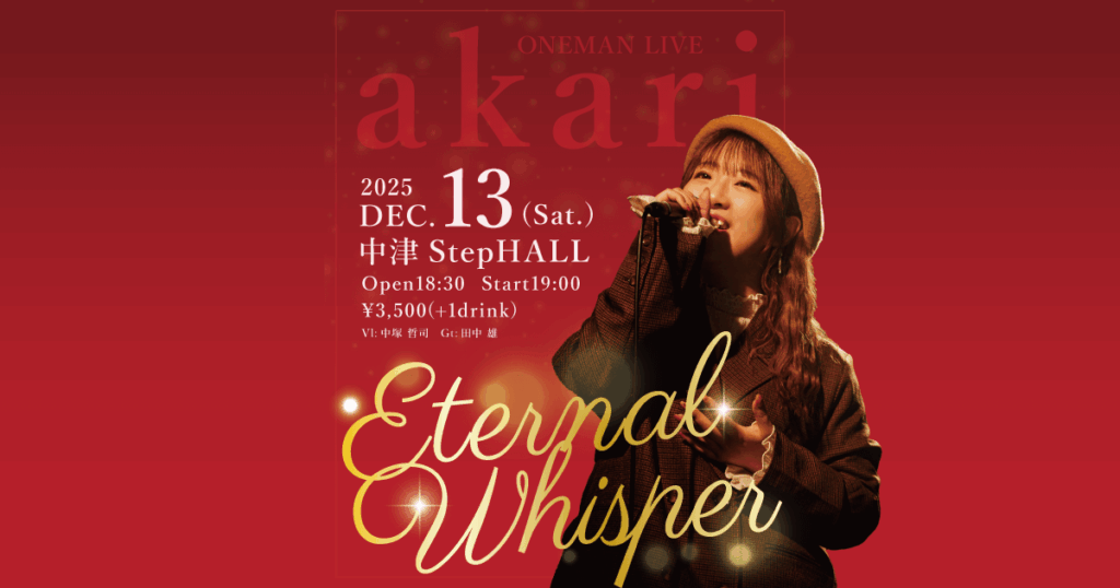 2025年12月13日(土) akari oneman live Eternal Wisper 2025 10/03 Live サポート:Vl. 中塚 哲司 Gt. 田中 雄 日時:2025年12月13日(土) open/18:30 start/19:00会場:中津StepHALL料金:3,500円(+1drink) Live URLをコピーする URLをコピーしました! URLをコピーしました! 2025年10月06日(木) ゆしんの夜 第144夜 にギタリストとして出演 この記事を書いた人 yutanaka ミュージシャンでWebデザイナーです。 まだまだ大変な世の中。アウトプットの場所を求め、サイトを立ち上げたりブログに挑戦したりしています。 この著者の記事一覧へ 関連記事 2025年10月06日(木) ゆしんの夜 第144夜 にギタリストとして出演 2025年10月3日 2025年12月20日(土) ☆☆☆ 2025年9月13日 2025年10月23日(木) OH!DARUMA 2025年9月13日 2025年10月02日(木) ゆしんの夜 第143夜 にギタリストとして出演 2025年9月13日 2025年9月20日(土) akari oneman live Dear Home 2025年8月9日 2025年09月04日(木) ゆしんの夜 第142夜 にギタリストとして出演 2025年8月9日 2025年08月07日(木) ゆしんの夜 第141夜 にギタリストとして出演 2025年7月15日 2025年8月28日(木) 行け!ポニー 2025年7月2日 コメント コメントする コメントをキャンセルコメント ※ 名前 ※ メール ※ サイト 次回のコメントで使用するためブラウザーに自分の名前、メールアドレス、サイトを保存する。 上に表示された文字を入力してください。